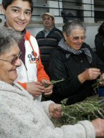 As pessoas acumulam-se ao longo do percurso. A vila encheu-se de automóveis, estacionados por todo o lado, que não param de derramar gente pelas ruas. Quem chega, percorre primeiro as ruas atapetadas de flores, vai pingando conversa com os conhecidos, eventualmente toma uma bica e, depois, escolhe um lugar para ficar à espera da procissão. Os homens - pais, filhos, avôs, netos, irmãos, amigos- separam-se das esposas, das mães, das avós, das netas, das amigas, das irmãs e encaminham-se para a igreja, de tocha (ramo mais ou menos escultural, de flores mais ou menos silvestres) na mão.