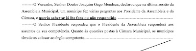 António Eusébio deixou bem claro que não reconhece à Assembleia Municipal competências para responder a questões relativas à actividade da Câmara Municipal. Não devem os munícipes são-brasenses esperar qualquer tipo de fiscalização por parte da Assembleia Municipal às actividades da Câmara Municipal de São Brás de Alportel.